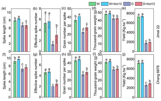 Effects of Act12 inoculation on spike length (a,f), effective spike number (b,g), grain number per spike (c,h), thousand-grain weight (d,i), and yield (e,j) in two wheat varieties ((a–e) Jimai 22; (f–j) Chang 6878) under different water conditions. Data presentation: mean ± standard deviation (SD). For spike length, effective spike number, grain number per spike, and thousand-grain weight (n = 5), yield data (n = 3). Statistically significant differences are denoted by distinct alphabetical letters (p < 0.05).