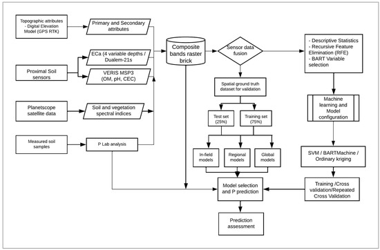 The fused dataset consists of a spatial matrix of measured soil observations and corresponding values of available predictors. This spatial matrix was built as input to Support Vector Machine (SVM) and Bayesian Additive Regression Trees (BART) machine learning algorithms. We used the raster to points function in ArcGIS Pro [52] to collect values of PSS and RS predictors at locations (X and Y) of measured soil P. This allowed us to proceed to sensor data fusion and integrate all collected data in space. The fused spatial dataset was then considered as the ground truth dataset, which we used during the training and validation of our machine learning spatial prediction models (see Section 2.4 about machine learning and model configurations). Powerful predictors were then identified by each machine learning model (see Section 2.6 and Section 3.3 for more details about variable selection approaches).