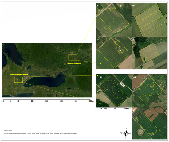 Seven fields representing the study area in Ontario, Canada. Dots illustrate the locations of soil samples in two clusters of fields located in Greeley, eastern Ontario cluster of four fields (UTM 18N): NX (44.47 ha), SH (49.80 ha), VN (20.43 ha), KN (48.14 ha) fields, and Guelph, western Ontario cluster of three fields (UTM 17N): LN (21.14 ha), RB (30.32 ha), HN (39.37 ha). The total area covered by this research project is about 244 ha, at an average sampling density of two cores per hectare. Ground truth soil samples are fused and integrated with environmental predictors to develop ML spatial models for soil available P.