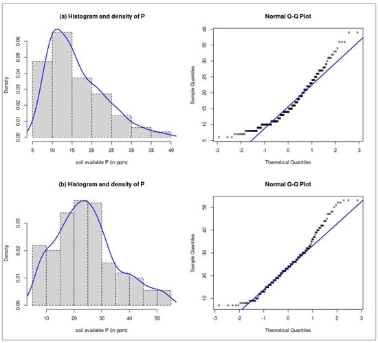 Histogram and normal Q-Q plot of soil available P within (a) the eastern Ontario and (b) western Ontario zones. Both datasets are approximately normally distributed since data points (denoted with an x) are near the straight reference line.