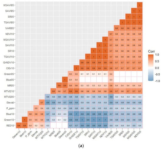 For the eastern Ontario (UTM 18N) zone (Figure 4a), soil available P is significantly (p < 0.05) correlated with the elevation predictor at an r value of 0.5. Soil available P exhibits a positive correlation with RGB bands of the PlanetScope remote sensing data acquired in October, RED10 (r = 0.4), Green10 (r = 0.5), and Blue10 (r = 0.6). Soil available P is also negatively correlated with PlanetScope NIR05 (r = −0.5), Blue05 (r = −0.4), and Green05 (r = −0.4) bands acquired in May. Further, a significant (p < 0.05) negative correlation with soil-vegetation indices, obtained from PlanetScope imagery, is present, varying in r values from r = −0.4 (TSAVI05, SR05, SAVI05, MSAVI05, NDVI05), r = −0.5 (TSAVI10, SR10, SAVI10, MSAVI10, NDVI10, MTVI210, VARI05), to r = −0.6 (ClGr10, GrNDVI10). Soil available P is positively correlated with only the MTVI205 soil-vegetation index index (r = 0.4) within both UTM 18N and 17N zones.