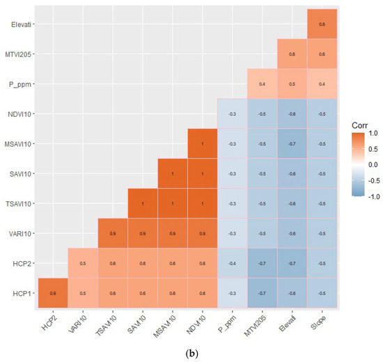 Correlation matrix of soil available P and auxiliary predictors within (a) eastern Ontario zone and (b) western Ontario zone. Significant coefficient of correlation at p < 0.05 are shown with color intensity changing based on the degree of correlation (significant positive or negative correlation). Correlated predictors are clustered into blocks with similar color intensity to highlight multicollinear features. Insignificant pairwise correlations at the 0.05 level are left blank.