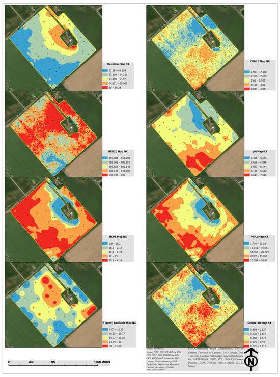 Soil samples were collected based on a regular grid (field ID codes KN, VN, HN, RB, LN) or a combination of random and directed (NX, SH) sampling. In total, 479 composite samples were collected along with GPS locations. Composite samples are made of up to 10 core samples with an approximate depth of 15 cm. The physical soil sampling density is roughly two samples per hectare. The maximum distance between a pair of points is estimated at 672 m, while the minimum is 64 m. Soil samples were collected and analyzed as ground truth data for the spatial modeling of soil available P. Laboratory measured extractable phosphorus (P) was carried out using the P—Olsen sodium bicarbonate test method. Measurements of soil available P are expressed in ppm. Supplementary Table S1 summarizes more details related to the number of soil samples per field, available PSS covariates, number of PSS readings per field for each PSS sensor, and acronyms for predictive models based on the geographic UTM zone where fields are located.