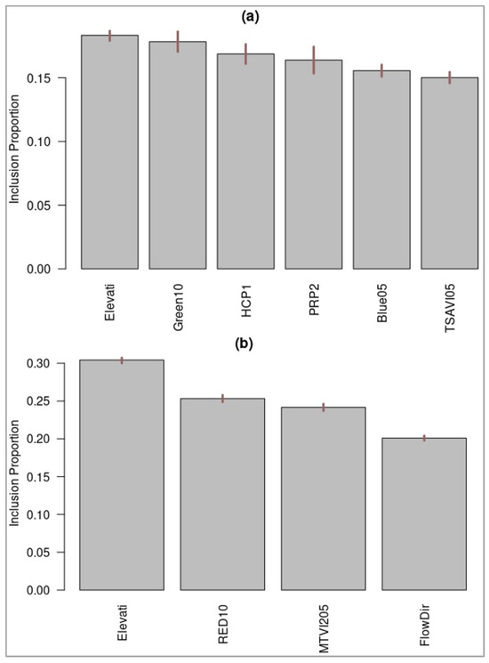 The BART variable selection method is not applied in the same way as RFE. BART is primarily used for modeling the relationship between features and a target variable, with a focus on capturing complex, non-linear relationships. The first step in variable selection with BART is to train a BART model considering all available features. BART grows a set of regression trees, with each tree attempting to capture a portion of the relationship between the predictors and the target variable. Trees are sequentially added to the model. “Variable inclusion proportions” is deployed for reduction of variables and to characterize the relative importance of a given variable. This metric is the ratio of number of times each predictor is selected as a splitting rule over the total number of splitting rules. Selection rules and best thresholds definition for variable inclusion proportions are implemented via cross-validation using BartMachine package. We use var_selection_by_permute_response_cv() function to define variable inclusion proportions for observed data and pick the appropriate threshold for variable selection. Cross-validation on the out-of-sample RMSE leads to a basis for selecting meaningful predictors.