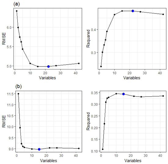 Recursive Feature Elimination (RFE) was used to select the most important environmental predictors for SVM. RFE is a feature selection technique used in machine leaning for variable selection and identification of the most important features in a dataset. RFE is a feature selection algorithm that ranks the environmental predictors based on their importance according to a scoring metric, such as mean squared error, R-squared, or explained variance. RFE algorithm works by recursively removing the least important feature, re-training the model on the remaining features, and then evaluating the performance on a validation set. The process is repeated until a desired number of features is obtained or the performance improvement on the validation set is below a certain threshold. RFE is a backward selection method, starting with all features and gradually removing the least important ones. The final list of features is then used as input to the SVM algorithm for training and prediction. RFE is commonly used in high-dimensional datasets to reduce the number of features, while improving the performance and interpretability of the model [81]. RFE was performed using the ‘caret’ package [68,69], which provides a convenient function for implementing RFE called ‘rfe’. The ‘rfeControl’ argument was used to specify RFE control parameters, such as the number of cross-validations and the function to be used.