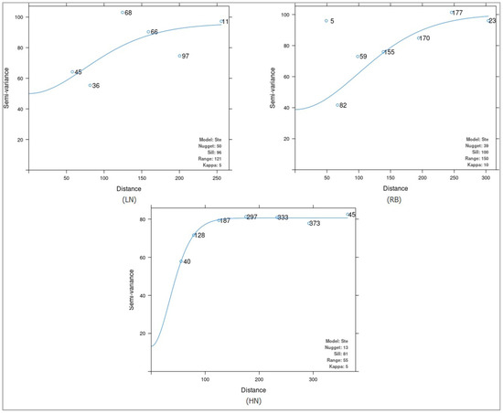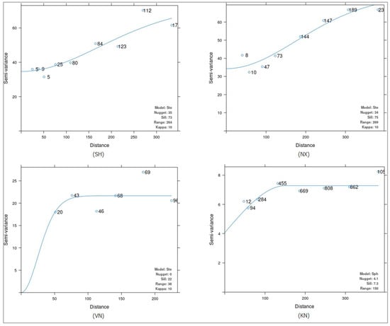 In this study, we fit variogram models for each field. The optimal variogram model (i.e., Spherical (Sph), Exponential (Exp), Gaussian (Gau), Matern, M. Stein’s parametrization (Ste)) is selected based on the data structure and in-field spatial variability. Fitting of field data to the selected model provides parameters of the variogram model (i.e., nugget, still, and range). The nugget effect can be attributed to measurement errors or spatial sources of variation at distances smaller than the sampling interval. The sill (the plateau level) of the variogram represents the overall variance of the dataset, and the range represents the distance at which spatial autocorrelation becomes negligible.