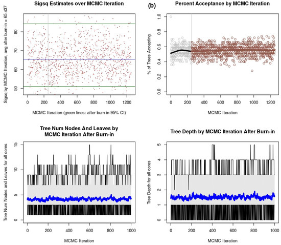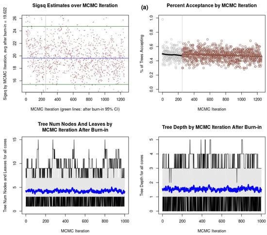 In addition to α, β, k, the optimal number of trees m can be tuned via cross-validation. Hence, priors and likelihood distributions are used to generate predictions based on an iterative backfitting Monte Carlo and Markov chain (MCMC) algorithm. More details on Bayesian inference for ensemble regression trees can be found in [73,75].