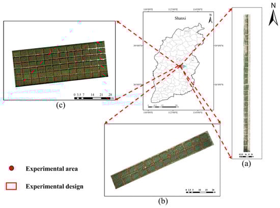 Geographic locations and drone imagery of the experimental sites in 2022 and 2023. (a) Depicts the location of the Wujiabao experimental field. (b) Depicts the location of the Shenfeng experimental field. (c) Depicts the location of the Taoyuanbao experimental field.