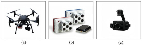 UAV near-ground remote sensing platform. (a) Four-rotor UAV; (b) Multi-spectral imaging system; (c) Thermal imaging camera.