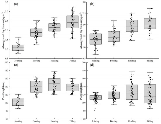 The boxplots of millet plant height and AGB at different growth stages. (a) AGB for the year 2022; (b) AGB for the year 2023; (c) Plant height for the year 2022; (d) Plant height for the year 2023.