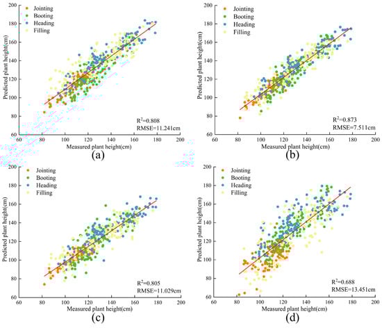 The relationship between the predicted PH values and measured PH values in point cloud data from UAV-based RGB images. (a) Maximum point cloud height; (b) 99th percentile of point cloud height; (c) 95th percentile of point cloud height; (d) CHM.