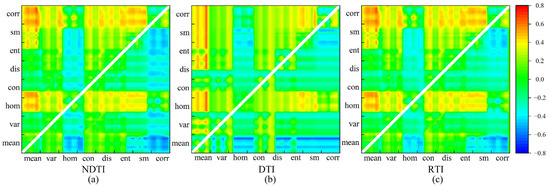 The correlation coefficients between AGB and texture indices (a) Normalized Difference Texture Index. (b) Difference Texture Index. (c) Ratio Texture Index. Any point in the figure represents the correlation coefficient between the texture index, which is obtained by the normalization, ratio, and difference in the two texture feature values corresponding to the horizontal and vertical coordinates of the point, and the AGB.