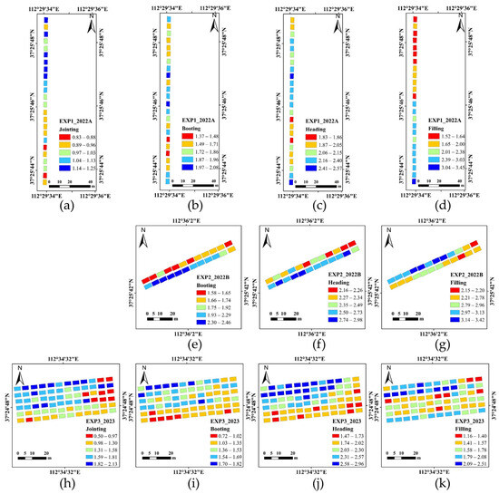 AGB at different growth stages using the RF model incorporating SPs + TIS + T + PH. Experiment 1 (a–d); Experiment 2 (e–g); Experiment 3 (h–k); Jointing (a,h); Booting (b,e,i); Heading (c,f,j); Grain filling (d,g,k).