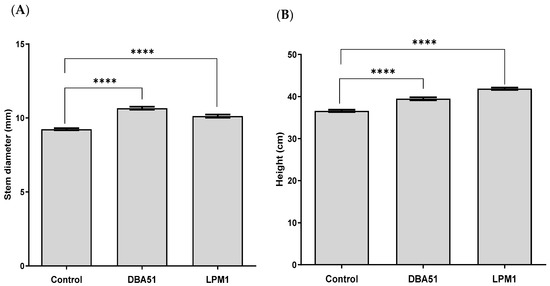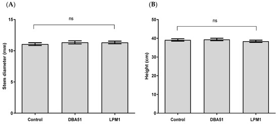 Interestingly, the biometric stem diameter and plant height parameters evaluated in the jalapeño pepper PS11435807 plants at 75 DAT did not reveal significant differences between the DBA51 and LPM1 treatments and the uninoculated control (Figure 2A,B).