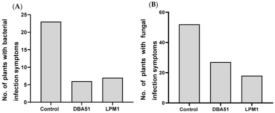 Disease incidence in DRD8551 tomato plants. (A) Number of plants showing indicative symptoms of bacterial infection. (B) Number of plants showing indicative symptoms of fungal infection. Control, uninoculated plants; DBA51, plants treated with Enterobacter sp. DBA51; and LPM1, plants treated with Bacillus subtilis LPM1.