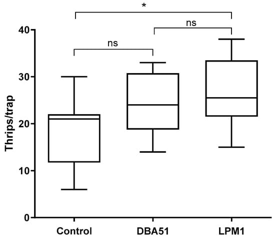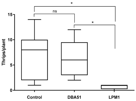 Thrips number in traps localized within pepper PS11435807 plots. Control, uninoculated plants; DBA51, plants inoculated with Enterobacter sp. DBA51; and LPM1, plants inoculated with Bacillus subtilis LPM1. Bars represent mean values ± SE, n = 12, significance level = *, ns = non-significance. ANOVA, Kruskal–Wallis test at p < 0.05.