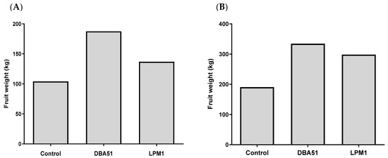 Fruit yields produced by tomato DRD8550 (A) and jalapeño pepper PS11435807 (B) plants inoculated with Enterobacter sp. DBA51 (DBA51) and Bacillus subtilis LPM1 (LPM1) compared to those by uninoculated plants (control) under field conditions. Total fruit weight per treatment is represented in kg.