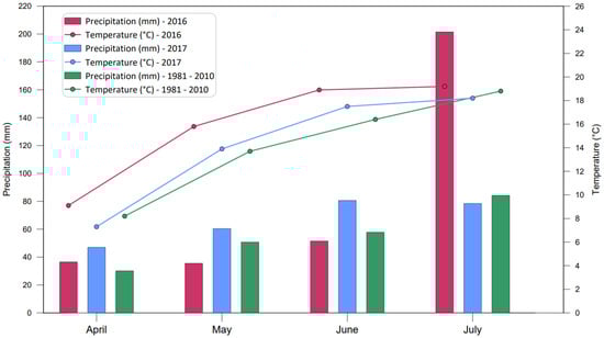 The total amount of rainfall from April to July in 2016 was 325.0 mm, and in 2017 during the same period the total amount of rainfall was 266.4 mm. In comparison, the total amount of rainfall from April to July calculated as an average for the years 1981–2010 was 222.8 mm. In 2017, in April, May, and June, during the period of emergence and the most intensive development of aboveground biomass, 188 mm of rain fell. These rainfalls were 52.2% more abundant than in the same period in 2016 and 35.6% higher than in the long-term period. July 2016 was the month of exceptionally heavy rainfall, and the total amount of rainfall during this period was 201.5 mm. These rainfalls were 123.1 mm higher than in July 2017 and 117.3 mm higher than the long-term average (Figure 1).