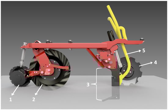 The strip-tillage unit (Czajkowski ST + PS) (https://czajkowski-st.com/, accessed on 15 January 2024). 1—spreading and breaking disc; 2—wavy cutting disc; 3—cultivation knife; 4—closing and compacting disc; 5—fertilizer pipe.