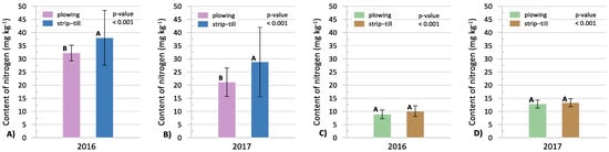 The content of mineral N: (A) 3 weeks after sowing in 2016; (B) 3 weeks after sowing in 2017; (C) at harvest in 2016; (D) at harvest in 2017. The values are the means for the sampling places (rows and inter-rows) and soil layers (0–20 and 20–40). A, B: the mean values with different letters are significantly different (ANOVA at the significance level p = 0.05).