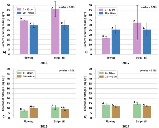 The content of N in soil layers 0–20 cm and 20–40 cm: (A) 3 weeks after sowing in 2016; (B) 3 weeks after sowing in 2017; (C) at harvest in 2016; (D) at harvest in 2017. The values are the means for the sampling places (rows and inter-rows). A–C: the mean values with different letters are significantly different (ANOVA at the significance level p = 0.05).