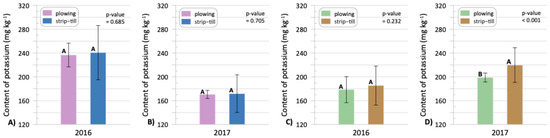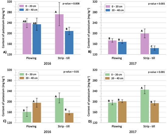 Just before harvesting of the crop in 2016 and 2017, the soil from the 0–20 cm layer under strip-tilling, regardless of the place of sampling (row, inter-row), was characterized by a higher K content than from the 20–40 cm layer (Figure 6C,D). On the contrary, under plowing in 2016, the 20–40 cm layer was characterized by a higher concentration of K.