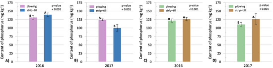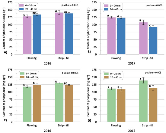 The analysis of P content in the soil three weeks after sowing indicates that, under plowing, both in 2016 and 2017, the distribution of P in the 0–20 and 20–40 cm soil layers was similar (Figure 8A,B). In turn, under strip-tillage in 2017, there was more P in the 0–20 cm soil layer than in the 20–40 cm layer. Similar results were obtained in many studies, where P content in the soil, after deep fertilization using strip-till equipment, tends to be higher in the 10–20 cm soil layer [8,48]. In general, Nze Memiaghe et al. [54] claim that the distribution of phosphorus in the soil profile is more even under conventional than conservation tillage. Stankowski et al. [46] state that the distribution of P in the soil profile is more even in under conventional cultivation than in the case of conservation cultivation, which is caused by frequent mixing and turning of the soil in the plow system. In conservation tillage, phosphorus accumulates in the shallower soil layer because it is less mobile.