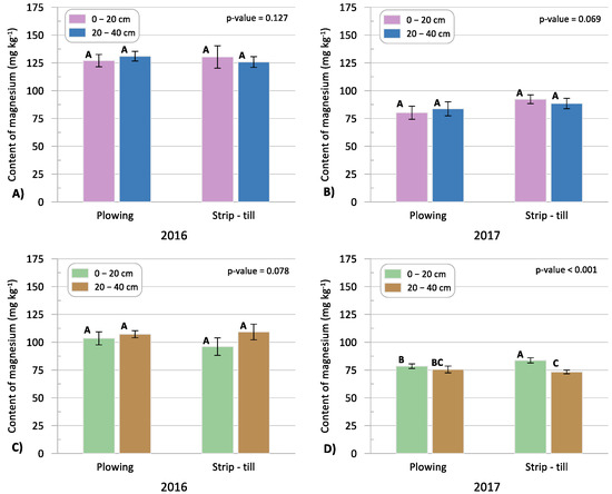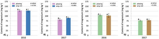 The content of available Mg: (A) 3 weeks after sowing in 2016; (B) 3 weeks after sowing in 2017; (C) at harvest in 2016; (D) at harvest in 2017. The values are the means for the sampling places (rows and inter-rows) and soil layers (0–20 and 20–40). A, B—the mean values with different letters are significantly different (ANOVA at the significance level p = 0.05).