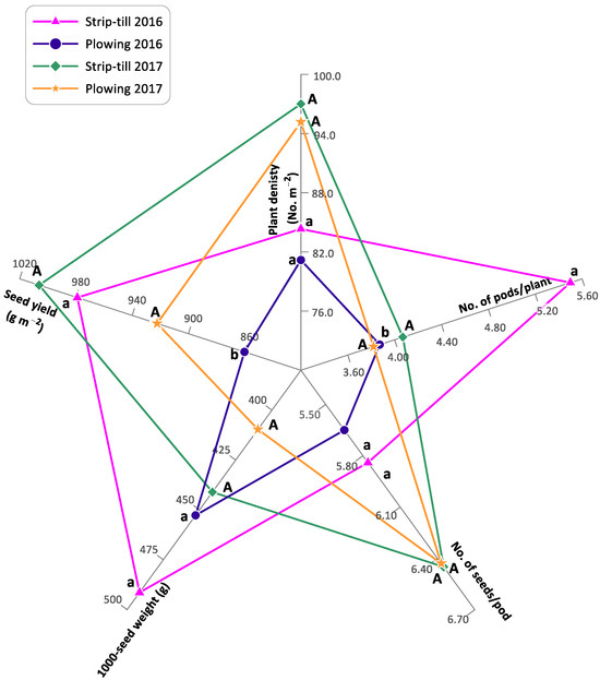 Yield and yield components of the green peas, depending on soil tillage methods in 2016 and 2017. A, a, b—the mean values with the same letters are not significantly different (ANOVA at the significance level p = 0.05).