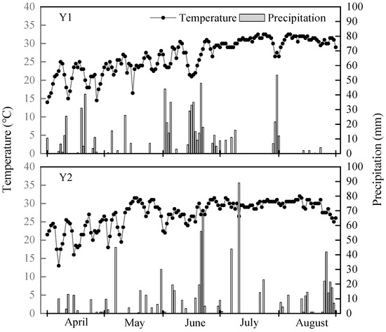 Figure 1. Dynamic changes of daily mean temperature and precipitation in the experimental area during the rice growing period in the research years. Note: Y1: the first experimental year; Y2: the second experimental year.