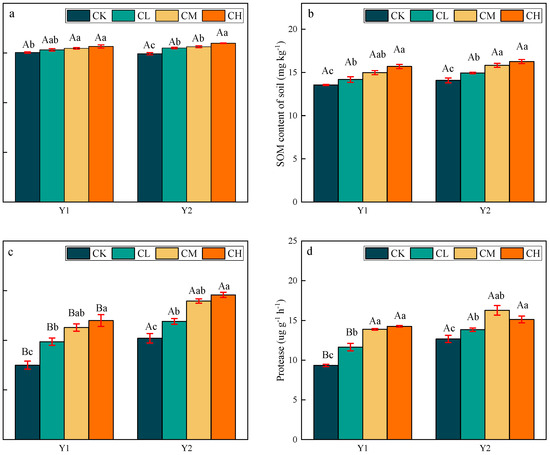 Figure 2. pH value (a), SOM content (b), urease activity (c), and protease activity (d) of soil in different experimental years. Note: Y1: the first experimental year; Y2: the second experimental year. Capital letters represent differences in different years in the same treatment, and lowercase letters represent differences in different treatments in the same year.