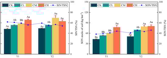 Figure 3. SIN and SON stocks in a 0–60 cm soil profile in different experimental years. Note: Y1: the first experimental year; Y2: the second experimental year. Capital letters represent differences in different soil layers in the same treatment, and lowercase letters represent differences in different treatments in the same soil layer.