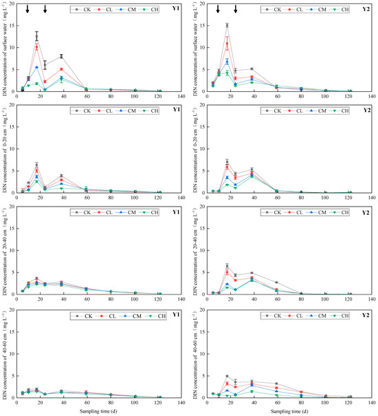 Figure 4. Variation of DIN concentrations in soil water from different depths in paddy soil under different fertilization treatments during the rice growth period in different experimental years. Note: Y1: the first experimental year Y2: the second experimental year. The arrow denotes the timing of N fertilization.