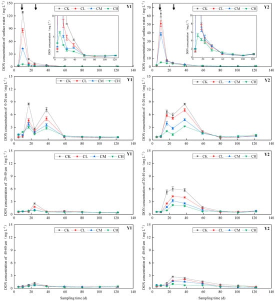 Figure 5. Variation of DON concentrations in soil water from different depths in paddy soil under different fertilization treatments during the rice growth period in different experimental years. Note: Y1: the first experimental year; Y2: the second experimental year. The arrow denotes the timing of N fertilization.