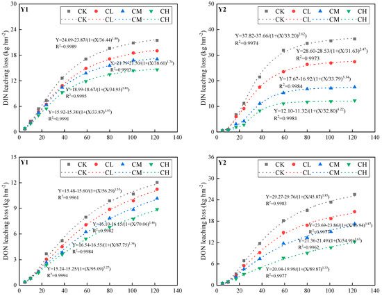 Figure 6. Fitting curves of DIN and DON leaching-loss dynamics in paddy soil in different experimental years. Note: Y1: the first experimental year; Y2: the second experimental year.