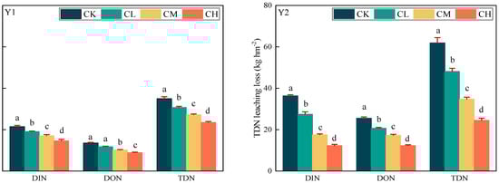 Figure 7. Potential leaching loss of DIN and DON in paddy soil in different experimental years. Note: lowercase letters represent differences in different treatments in the same year at p < 0.05. Note: Y1: the first experimental year; Y2: the second experimental year.