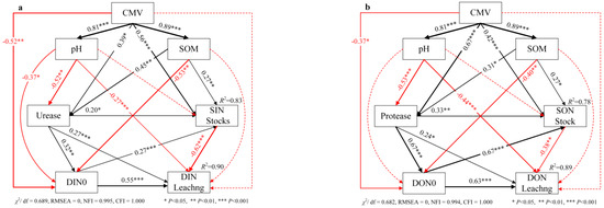 The effect of CMV application on N leaching is consistent with our hypothesis of causal relationships, as showed by the SEM properties (χ2/df < 3, RMSEA < 0.05, NFI > 0.9, CFI > 0.9, Figure 8) and was able to explain 83% of SIN stocks and 90% of DIN leaching (Figure 8a). CMV application showed a direct positive effect on SIN accumulation, with a path coefficient of 0.56, whereas there was no significant direct effect on DIN leaching. On the other hand, CMV application can indirectly influence SIN stocks and DIN leaching by affecting soil properties (pH, SOM, and urease) and DIN concentration in surface water, with path coefficients of 0.25 and −0.25, respectively. Moreover, CMV application can indirectly influence DIN leaching by affecting SIN stocks, with a path coefficient of −0.50. The SEM analysis showed that the effects of CMV application explained 78% of SON stocks and 89% of DON leaching (Figure 8b). The application of CMV had a direct positive effect on SON accumulation (path coefficient = 0.42), but no significant direct effect on DON leaching. On the other hand, CMV application can indirectly influence SON stocks and DON leaching by affecting soil properties (pH, SOM, and protease) and DON concentration in surface water, with path coefficients of 0.29 and −0.48, respectively. Moreover, CMV application can indirectly influence DON leaching by affecting SON stocks, with a path coefficient of −0.27.