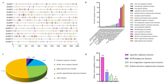 Cis-acting elements in the promoter regions of maize ADF family. (A) The distribution of cis-acting elements in the promoters of maize ADF gene family, where each color represents a cis acting element, and the same color in different genes represents the same cis acting element. (B) Quantitative statistics of different cis-acting elements in the promoters of maize ADF genes. (C) All elements can be divided into 5 categories, and the proportion of each type of component is showed. (D) Detailed information of 4 elements involved in abiotic-stress regulation.