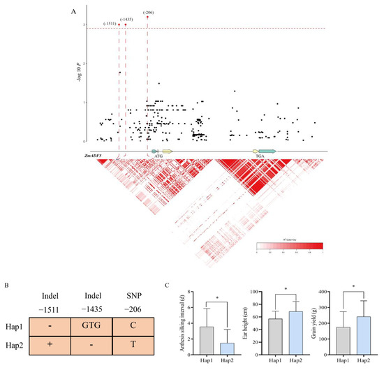 Candidate-gene association analysis in ZmADF5. (A) Linkage disequilibrium map for ZmADF5 drawn based on phenotypic date of drought-tolerant-related traits by candidate-gene association analysis. The red dash line represents the screening threshold for achieving significant differences. The green arrow in the figure represents the 5′-UTR and 3′-UTR of the ZmADF5 gene, and the yellow arrow represents the 3 exon regions. (B) Based on 2 Indel (−1511, −1435) and 1 SNP (−206), 115 inbred lines were divided into Hap1 and Hap2 haplotypes; “+” represents containing the corresponding mutation site, “−” represents not containing the corresponding mutation site. (C) Statistical analysis of anthesis silking interval, ear height and grain yield under Hap1 and Hap2 drought stress. Hap1 is represented in gray, Hap2 is represented in light blue. Significant difference analysis in the figure: * represents p < 0.05.