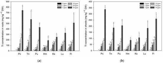 - Poscic, F.; Marchiol, L.; Schat, H. Hyperaccumulation of thallium is population-specific and uncorrelated with caesium accumulation in the thallium hyperaccumulator, Biscutella laevigata. Plant Soil 2013, 365, 81–91. [Google Scholar] [CrossRef]