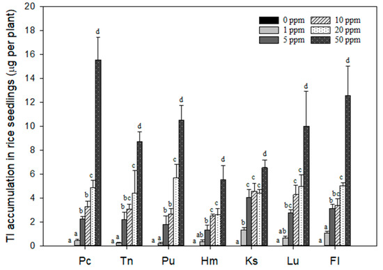 3.3. Effects of Tl Treatments on the Tl Contents in Rice Seedlings