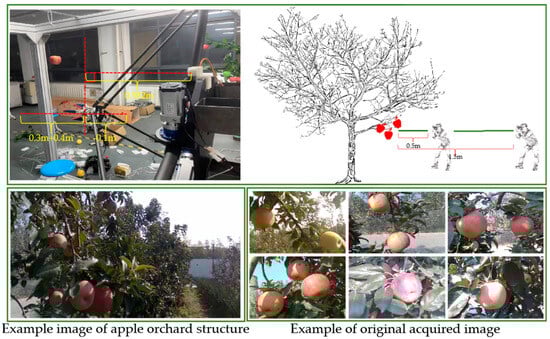 The experimental data used for research were collected from the Fuji apple experimental orchard of Shandong Agricultural University in Tai’an City, Shandong Province, China. To ensure various apple samples at different ripening stages, the sample collection was conducted multiple times between September and October 2022. As shown in Figure 1, color images were captured using a RealSense depth camera, and random sampling was performed at different locations within the orchard to cover various fruit states and environmental conditions. Considering that the working range of the apple picking robot was from −100 mm to 700 mm, and the distance between the camera installation position and the mechanical arm origin was 582 mm, the distance between the camera and the fruit tree was limited to the range of 0.5 m to 1.5 m to ensure that the apples in the images were within the appropriate shooting range. A total of 2000 apple images were collected and saved in .jpg format with a resolution of 1280 × 720 pixels.