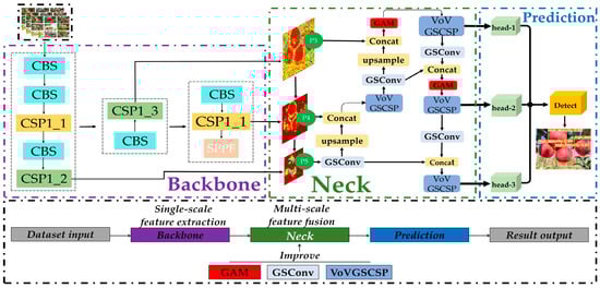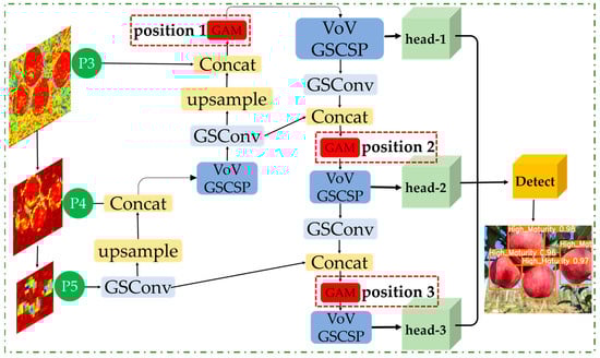 The original network’s neck section suffers from inadequate processing speed and lacks focus on color-specific features, which poses a significant challenge for real-time operation of apple-picking robots, as they require swift and accurate identification of apple ripeness. Therefore, in response to these requirements, we implemented enhancements to the neck section. We replaced the original network’s CBS and CSP2_1 modules with GSConv and VoVGSCSP modules to enhance processing speed and to better emphasize color-specific features related to apple ripeness. Additionally, we introduced a global attention mechanism (GAM) to more effectively extract texture information, particularly emphasizing defect categories. The improved model is abbreviated as YOLOv5s-GGV, where the first “G” represents global attention mechanism, the second “G” represents GSConv modules, and “V” represents VoVGSCSP modules. The improved YOLOv5s-GGV network structure is shown in Figure 4.The motivation behind these improvements is to achieve more precise and faster apple ripeness detection to meet the real-time operational requirements of practical harvesting robots.