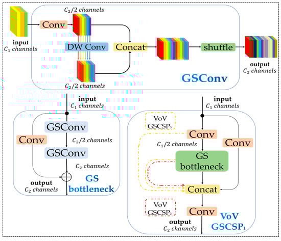 To address this, this study introduces lightweight convolution methods, GSConv, and cross-stage partial network module VoV-GSCSP as replacements for the original Conv and C3 modules in the feature fusion network. The network structures of GSConv and VoVGSCSP modules are illustrated in Figure 5 with the aim of alleviating the trade-off between model efficiency and accuracy, particularly in handling large-sized targets and optimizing the overall performance of the YOLOv5s model.