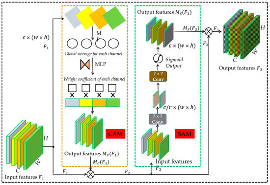 Here, and represent the channel and spatial attention modules, and ⨂ represents element-wise multiplication.