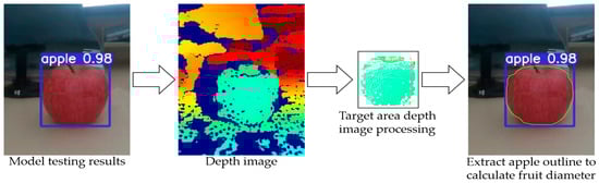 Under natural lighting conditions, the color images captured by the camera may be prone to distortions, and, simultaneously, depth data may experience information loss due to lighting variations and sensor noise [24]. To ensure accurate and swift measurement of apple diameter, primary attention was given to correcting distortions in the color images and repairing depth data. Current conventional depth filtering methods, such as Gaussian filtering, median filtering, temporal filtering, spatial filtering, and edge-preserving filtering, often necessitate whole-image processing, resulting in slower processing speeds [25]. Considering our exclusive focus on the depth data of the detected apple target area, we adopted a localized approach that emphasized the removal and completion of depth data in the identified fruit target region. The specific processing procedure is illustrated in Figure 7, depicting the workflow for depth data processing in a singular target region. This localized depth data processing method proved more efficient in enhancing processing speed while maintaining attention to the apple target area [26].