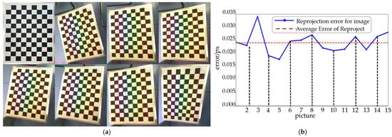 To assess the quality of images before and after distortion correction, we introduced the concept of a reprojection error. A reprojection error measures the deviation between points on the reconstructed image using the obtained calibration matrices and distortion parameters and the detected points on the original image. In this study, 15 randomly selected calibrated chessboard pattern images were used to calculate the reprojection error, yielding an average reprojection error of approximately 0.0249, as illustrated in Figure 8b.