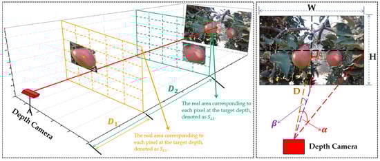 The process flow of the apple diameter calculation method is depicted in Figure 9, where 2α and 2β represent the horizontal and vertical field angles of the camera, respectively, and the resolution of the camera is W × H. D represents the depth of the target in the image. First, we need to calculate the conversion relationship between the pixel area and the actual area at a specific depth, as follows: