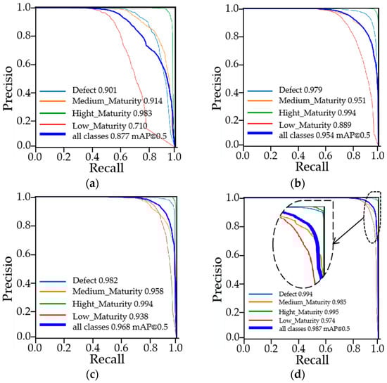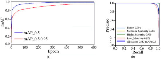 The change in mAP with thresholds of 0.5 and 0.5:0.95 during training is illustrated in Figure 10a. From the graph, it can be observed that, after approximately 450 epochs, both curves stabilized, indicating saturation in training. The precision–recall (P–R) curve for the best-trained model is depicted in Figure 10b, where the AP value for the fruit surface defect class was 0.994. The AP value for the medium maturity class was 0.985, for the high maturity class was 0.995, and for the low maturity class was 0.974. The mAP@0.5, representing the total average AP across all classes, was 0.987.