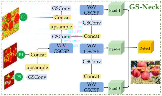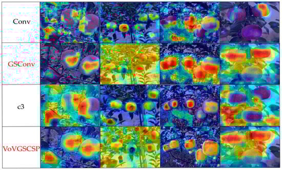In Figure 11, the structure diagram of the improved feature fusion network part (GS-Neck) is presented. To better understand the effect of convolutional neural networks on extracting apple feature information before and after the improvement, the visualization of feature extraction effects in some layers of the network detection layer was analyzed using the Grad-CAM heat map. Specifically, Conv and C3 layers in the original network detection layer and GSConv and VoVGSCSP layers in the improved network detection layer were selected for analysis. The visualized feature extraction effects are illustrated in Figure 12. The figures clearly demonstrate that the Conv and C3 layers in the detection layer of the original network extracted feature information ineffectively with unclear target contour edge information and indistinct extraction of key target areas influenced significantly by background noise. The improved model, through more precise feature extraction, minimized the interference of background noise on target features. As a result, there was an enhanced focus on target edge features and key areas. The heat map indicates that different categories of fruit received good differentiation in terms of texture, color, and other features.
